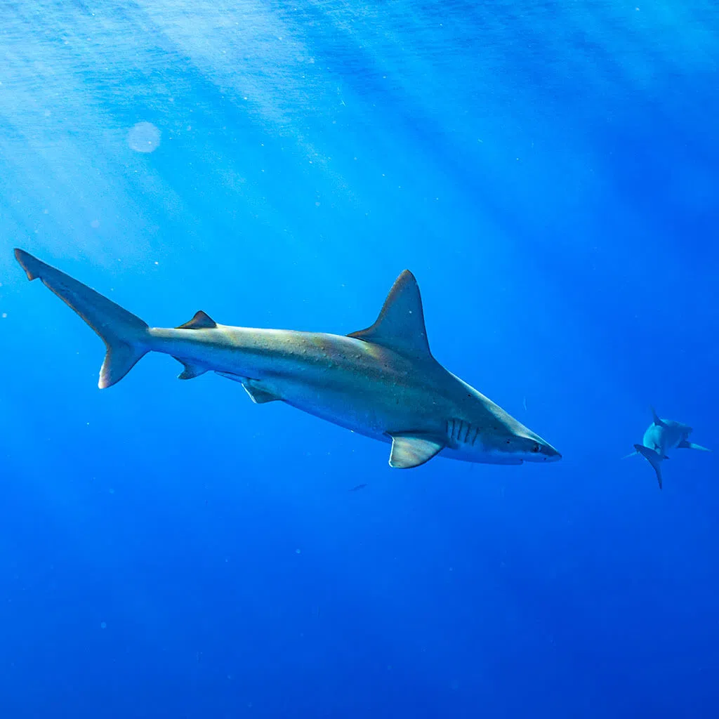 A species of requiem shark, in the family Carcharhinidae, found worldwide. This species favors clear reef environments around oceanic islands, where it is often the most abundant shark species. A large species that often reaches 9-10 ft. Galapagos sharks are active predators often encountered in large groups. Reproduction is viviparous, with females bearing litters of 4-16 pups every 2-3 years. The most commonly seen shark, their behavior is bold, inquisitive and persistent.